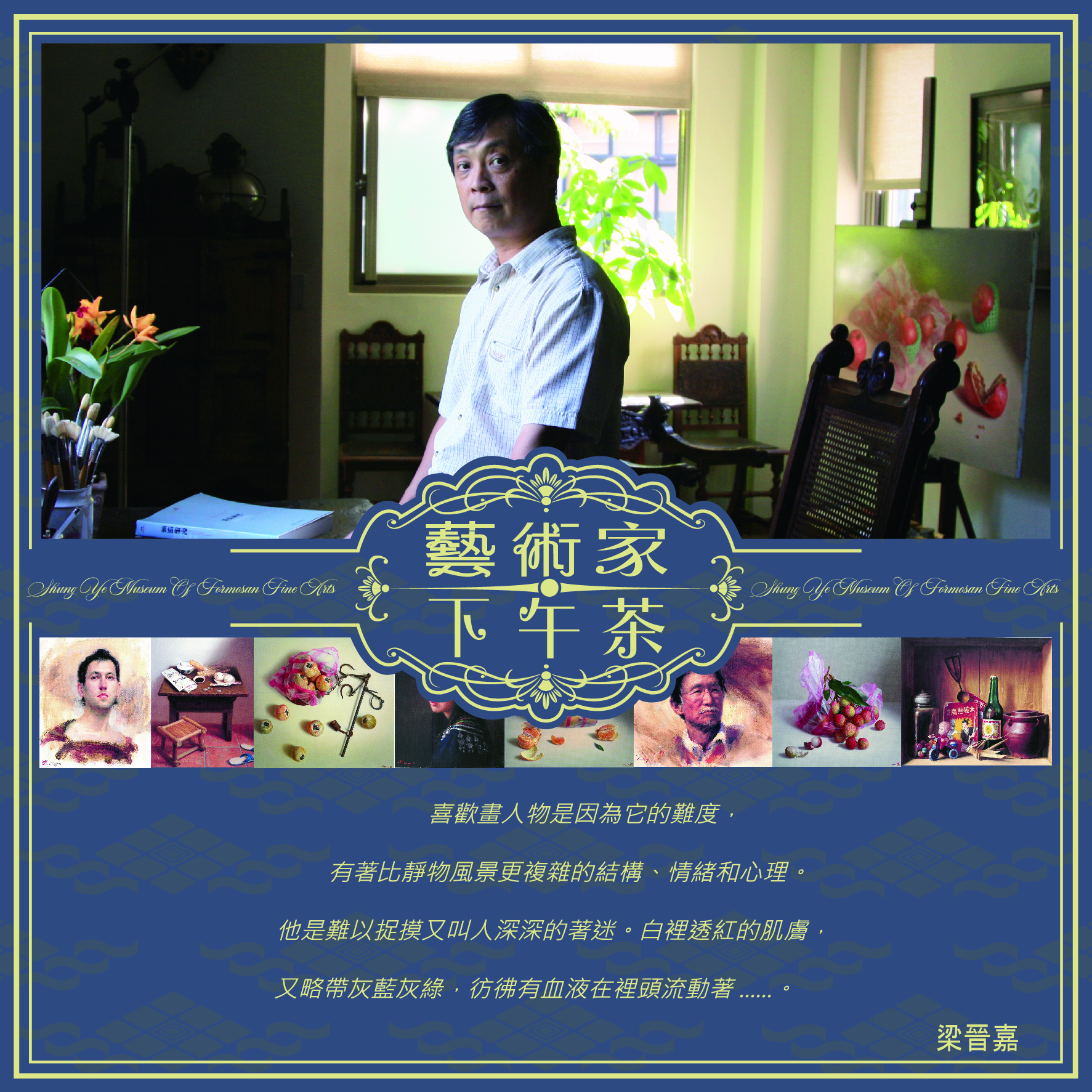 來館參觀過的民眾一定都有被二樓巨大的〈創辦人林清富先生寫真畫〉所吸引住目光,畫筆下所勾勒出的神韻維妙維肖,「喜歡畫人物是因為它的難度,有著比靜物風景更複雜的結構、情緒和心理…」–梁晉嘉。沒錯!這次我們藝術家下午茶的嘉賓就是擅長創作肖像畫與靜物畫 的梁晉嘉老師!