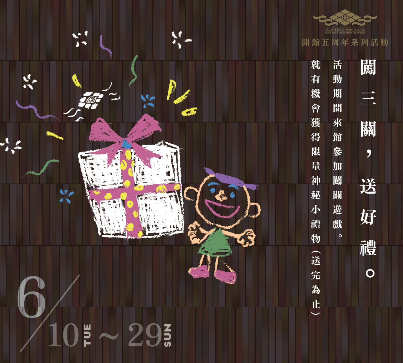(4) 闖三關,送好禮:凡於6/10至6/29來館,即可參加闖關遊戲,三關悉數答對後,將獲得美術館五週年紀念小禮物(數量有限,發完為止)。